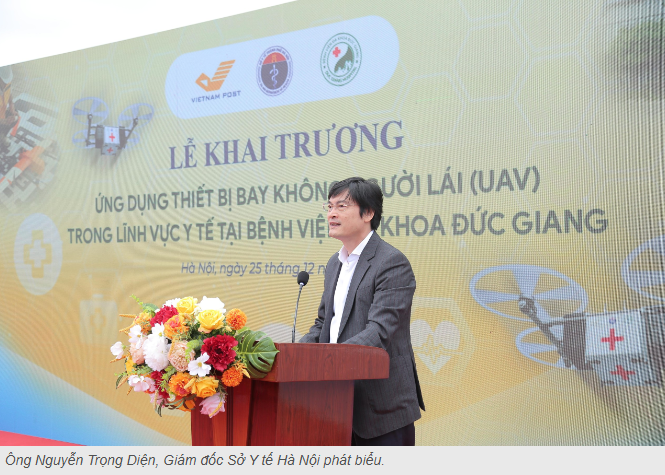 Phát biểu tại lễ khai trương ứng dụng thiết bị bay không người lái (UAV) trong lĩnh vực y tế diễn ra ngày 25/12, ông Nguyễn Trọng Diện, Giám đốc Sở Y tế Hà Nội, cho biết, việc triển khai UAV trong vận chuyển y tế là bước đi cụ thể của Bệnh viện Đa khoa Đức Giang trong ứng dụng khoa học công nghệ.
