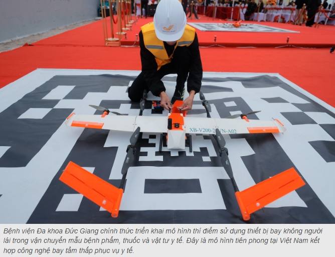 Thiết bị bay UAV có tốc độ hành trình lên tới 60 km/h, phạm vi hoạt động bán kính 15km, được tích hợp camera giám sát hành trình theo thời gian thực. Khoang chứa chuyên dụng được thiết kế bảo đảm các điều kiện cần thiết đối với mẫu bệnh phẩm, thuốc và vật tư y tế.