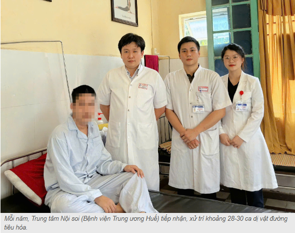 Phó Giám đốc Trung tâm Nội soi (Bệnh viện Trung ương Huế) cho biết, dị vật đường tiêu hóa là một trong những tình huống cấp cứu thường quy nhưng chưa bao giờ hết nguy hiểm. Tại Trung tâm, trung bình mỗi năm tiếp nhận, xử trí khoảng 28-30 ca. Đối tượng gặp phải rất đa dạng, từ trẻ nhỏ dưới 5 tuổi hay tò mò cho đồ vật vào miệng, người già bị tuột răng giả, cho đến những người mắc bệnh lý tâm thần hoặc rối loạn ăn uống.