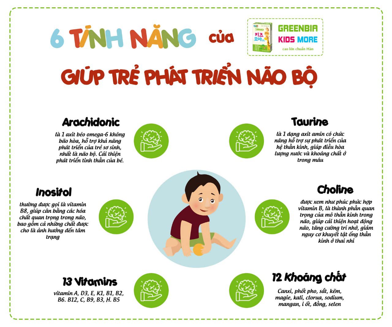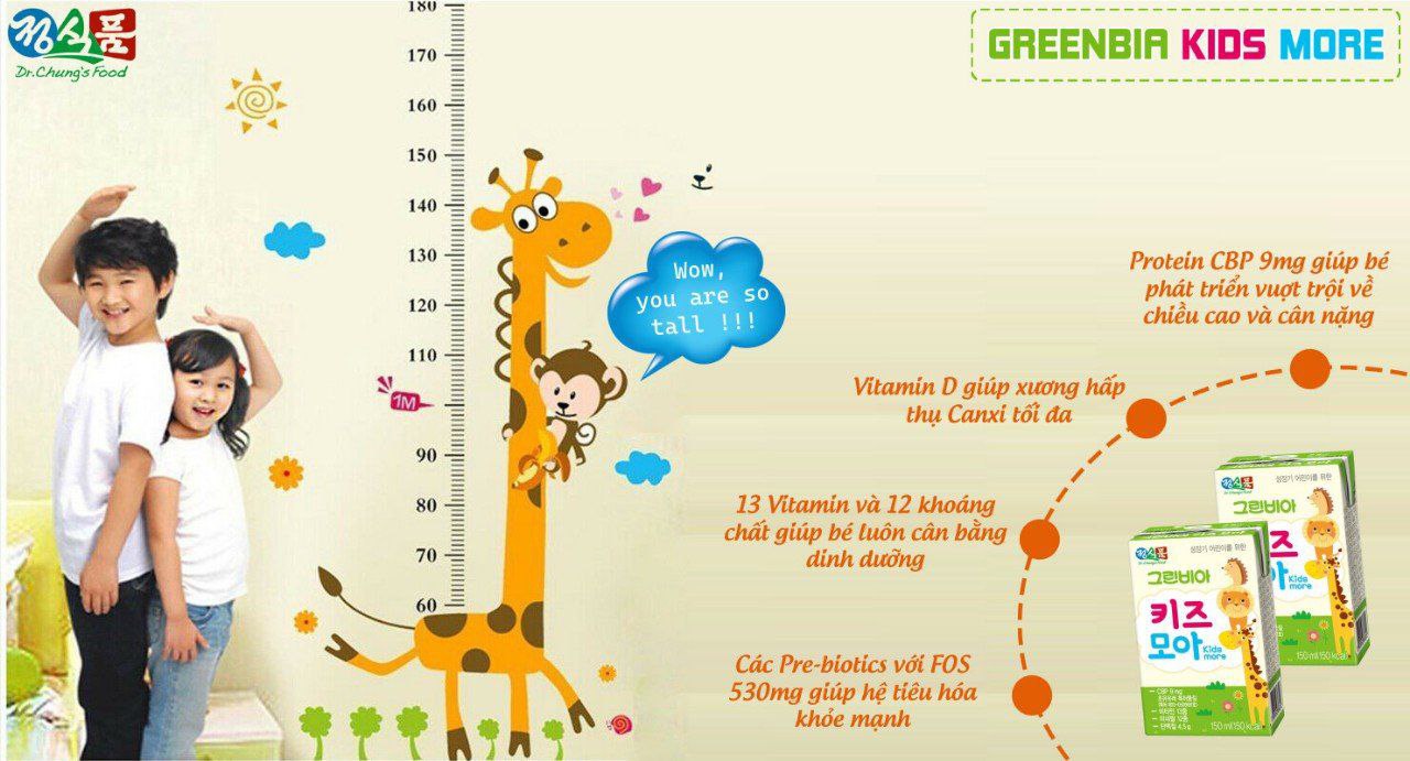 Greenbia Kids More được bổ sung can xi, thành phần CBP (Tinh chất sữa non CBP 9mg chuẩn hóa dưới dạng đạm Whey), vitamin D3… giúp trẻ tăng cao rõ rệt, tăng sức đề kháng và cải thiện cân nặng (đặc biệt với trẻ mới ốm dậy)