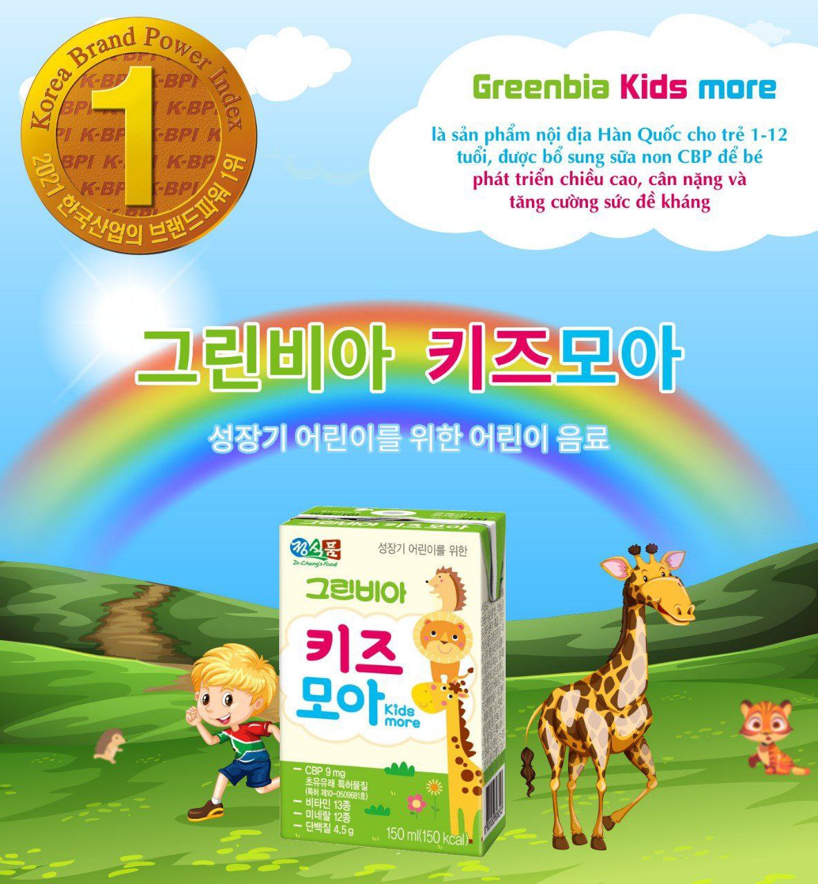 Greenbia Kids More được bổ sung can xi, thành phần CBP (Tinh chất sữa non CBP 9mg chuẩn hóa dưới dạng đạm Whey), vitamin D3… giúp trẻ tăng cao rõ rệt, tăng sức đề kháng và cải thiện cân nặng (đặc biệt với trẻ mới ốm dậy)